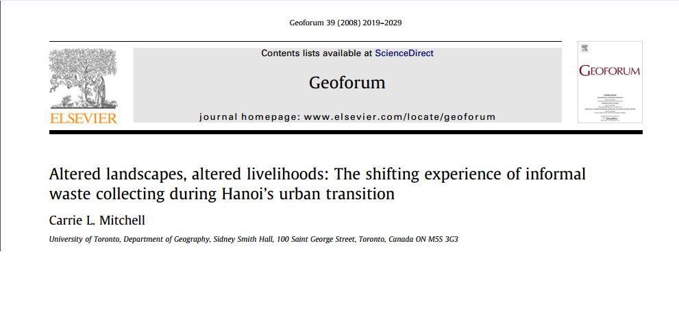 A growing body of literature is concerned with urbanization processes in contemporary Vietnam and how the country globalizing cities of Hanoi and Ho Chi Minh City are increasingly becoming spaces of consumption. However, much less is known about how these changing spaces accommodate labour, and in turn support livelihoods. Using published empirical data on Hanoi informal waste collectors from 1992 and my own data, including a survey of 575 waste collectors and 44 interviews, collected on Hanoi informal waste collectors in 2006, I explore the experiences of informal waste collectors (waste pickers and itinerant junk buyers) in Vietnam capital city of Hanoi. I argue that Vietnam globalizing economy and urban transition have been a catalyst for the growth of the informal waste collector population in Hanoi as well as a partial player in the gendering of this group and the work they undertake.